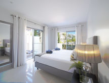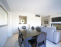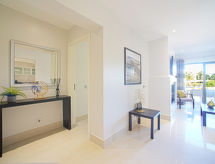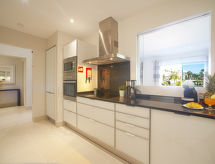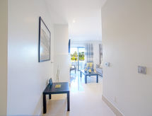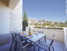 "Pine Hills Esmeralda", 3-room apartment 114 m2 on 1st floor. Modern and cosy furnishings: living/dining room with 1 sofabed (140 cm, length 190 cm), dining table, TV, international TV channels, flat screen, air conditioning and forced-air heating. Exit to the terrace. 1 room with 2 beds (90 cm, length 195 cm), shower/WC, air conditioning and forced-air heating. 1 room with 1 french bed (180 cm, length 195 cm), bath/WC, double hand-basin, air conditioning and forced-air heating. Exit to the terrace. Kitchen (oven, dishwasher, 4 ceramic glass hob hotplates, microwave, freezer, electric coffee machine, Capsules for coffee machine (Dolce Gusto Not Incl)). Sep. WC. Terrace furniture, deck chairs (2). Side view of the swimming pool and the garden. Facilities: washing machine, iron, children's high chair, baby cot for up to 2 year olds, hair dryer. Internet (WiFi, free). Parking space n L57 (roofed), garage. Please note: suitable for families. Non-smokers only. Fire extinguisher. 22794/AL