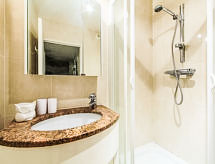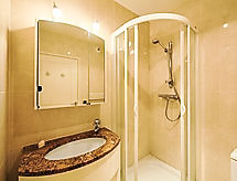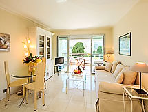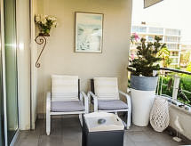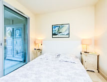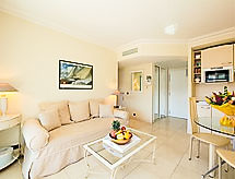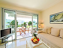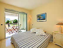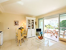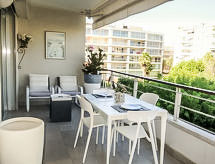 2-room apartment 35 m2 on 3rd floor. Very comfortable and modern furnishings: living/dining room with cable TV. Exit to the terrace. 1 room with 1 double bed (2 x 80 cm, length 190 cm). Exit to the terrace. Kitchenette (2 hot plates, dishwasher, microwave). Shower/WC. Electric heating, air-conditioning. Large terrace 16 m2, roofed, west facing position. Terrace furniture. View of the garden. Facilities: washing machine. Internet (WiFi, extra). Please note: TV only FR. Smoke alarm. 06029003723WF