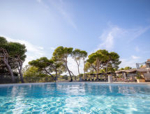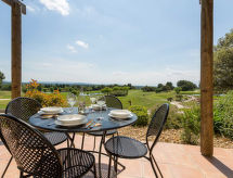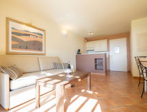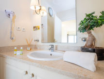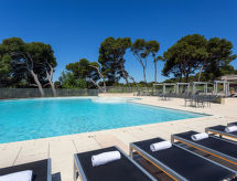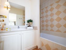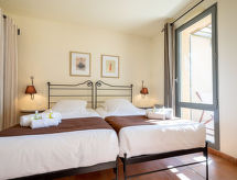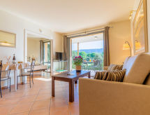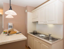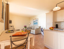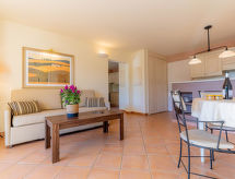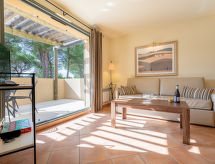 "Provence Country Club", 3-room apartment 46 m2. Beautiful furnishings: living/sleeping room with 1 sofabed, 1 pull-out bed, dining table and TV. 1 room with sliding door with 2 beds. 1 small room with 1 sofabed and 1 pull-out bed. Kitchenette (dishwasher, 4 ceramic glass hob hotplates, toaster, kettle, microwave, electric coffee machine). Bathroom, sep. WC. Electric heating. Balcony or terrace. Terrace furniture, balcony furniture. Facilities: safe (extra), children's high chair, baby cot. Internet (WiFi, extra). Parking. Please note: non-smokers only. Maximum 2 pets/ dogs allowed. Smoke alarm, fire extinguisher.