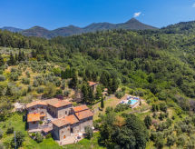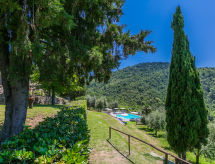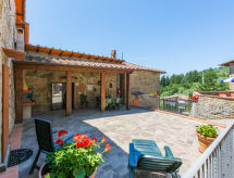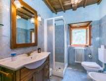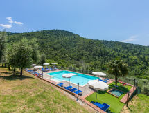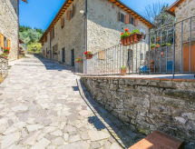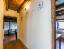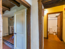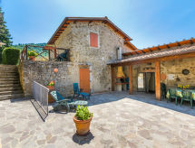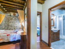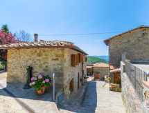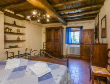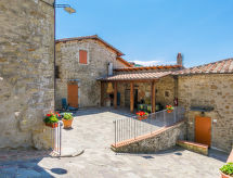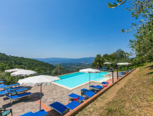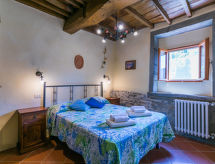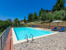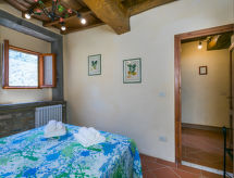 Borgo Stoppi, situated at 600 m a.s.l. at the foot of the Castello Poggio alla Regina, was a property of the counts Guidi since the 11th Century and after some changes of owners, in the 14th Century it became the main centre of the medieval district named "Curia del Castiglione" and agricultural capital of the surrounding mountain area, with its own town hall and big weekly market. Today, the old houses of the hamlet have been restored to 8 units, enhancing in a superb manner the beauty this affascinating place has maintained during the centuries: cypress, oak, pine and chestnuts trees are silent testimonies of Nature and wild boars, hares, squirrels, phaesants and owls may be watched in the surroundings. From the terrace covered with olive trees that produce one of the best and genuine olive oils of the area, you can enjoy a magnificent panorama over the Arno valley and the Chianti hills. Residence "Borgo Stoppi", 600 m a.s.l.. 2.5 km from the centre of Reggello, 30 km from the centre of Firenze, 35 km from the centre of Arezzo, in a quiet, sunny, elevated position, 70 km from the lake, in a cul-de-sac, in the countryside. For shared use: property 5'000 m2, swimming pool (6 x 12 m, depth 150 cm, seasonal availability: 22.May. - 08.Oct. pool opening hours: 08:00-21:00). Outdoor shower. Heating to be paid on the spot, heating available only from 01.Nov. - 07.Apr.. Steep motor access to the house (800 m via unmade road). Parking on the premises. Shop 2.5 km, grocery 2.5 km, supermarket 2.5 km, restaurant 2.5 km, bar 2.5 km, café 2.5 km, bus stop 3.5 km, railway station "Figline Valdarno" 10 km, bathing lake "Lago di Bilancino" 70 km. Nearby attractions: Firenze 40 km, Siena 86 km, Arezzo 64 km, Abazzia di Vallombrosa 16 km. Please note: car recommended. Suitable for families. The photograph shows a typical example.