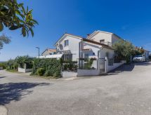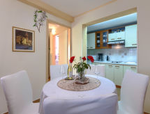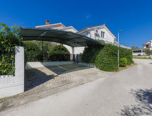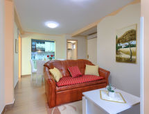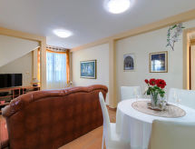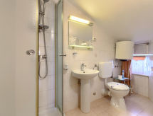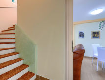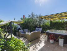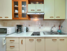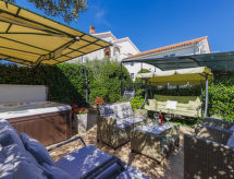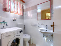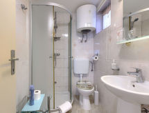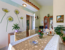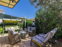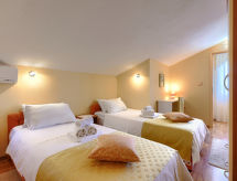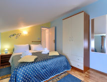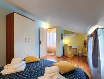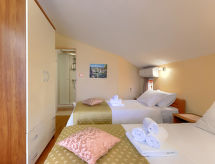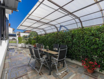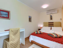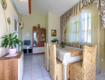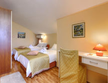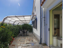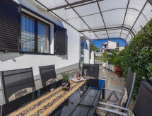 4-room house 96 m2 on 2 levels. Beautiful furnishings: living/dining room with satellite TV (flat screen), air conditioning. 1 room with 1 bed (140 cm, length 200 cm), separate WC and air conditioning. Dining room. Exit to the terrace. Open kitchen (2 hot plates, mini-oven, dishwasher, microwave, freezer, electric coffee machine). Shower/WC. No heating option. Upper floor: 1 room with sloping ceilings, - 160 cm with 2 beds (90 cm, length 200 cm), shower/WC and air conditioning. 1 room with sloping ceilings, - 160 cm with 1 french bed (160 cm, length 200 cm), shower/WC and air conditioning. Terrace 32 m2. Terrace furniture, deck chairs (4). Facilities: washing machine, telephone, safe, iron, mosquito net, hair dryer. Internet (WiFi, free).