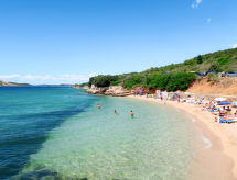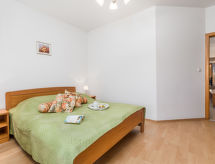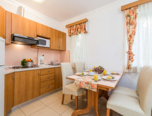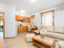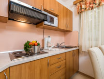 "Mihaela 4", 2-room apartment 35 m2 on 1st floor. Modern and cosy furnishings: living/dining room 18 m2 with 1 double sofabed, satellite TV and air conditioning. Exit to the balcony. 1 room with 1 double bed (160 cm, length 200 cm). Exit to the terrace. Open kitchen (4 hot plates, microwave, freezer). Shower/WC. Balcony, terrace 10 m2, roofed. Terrace furniture. View of the sea and the swimming pool. Facilities: safe. Internet (WiFi, free). Parking.