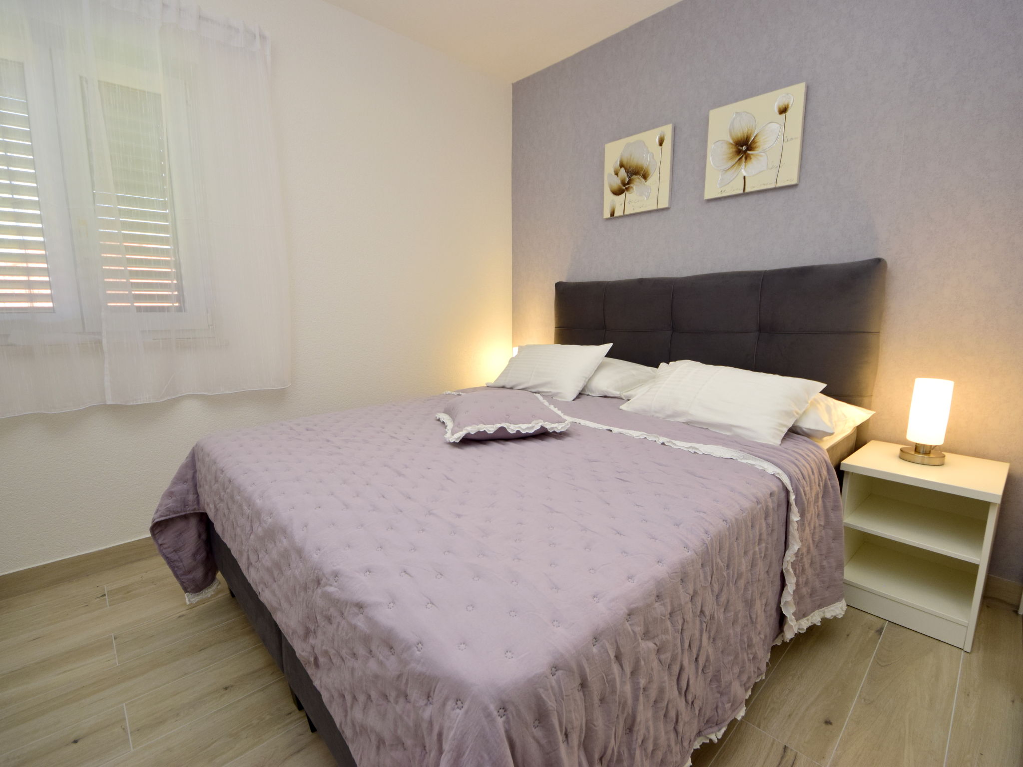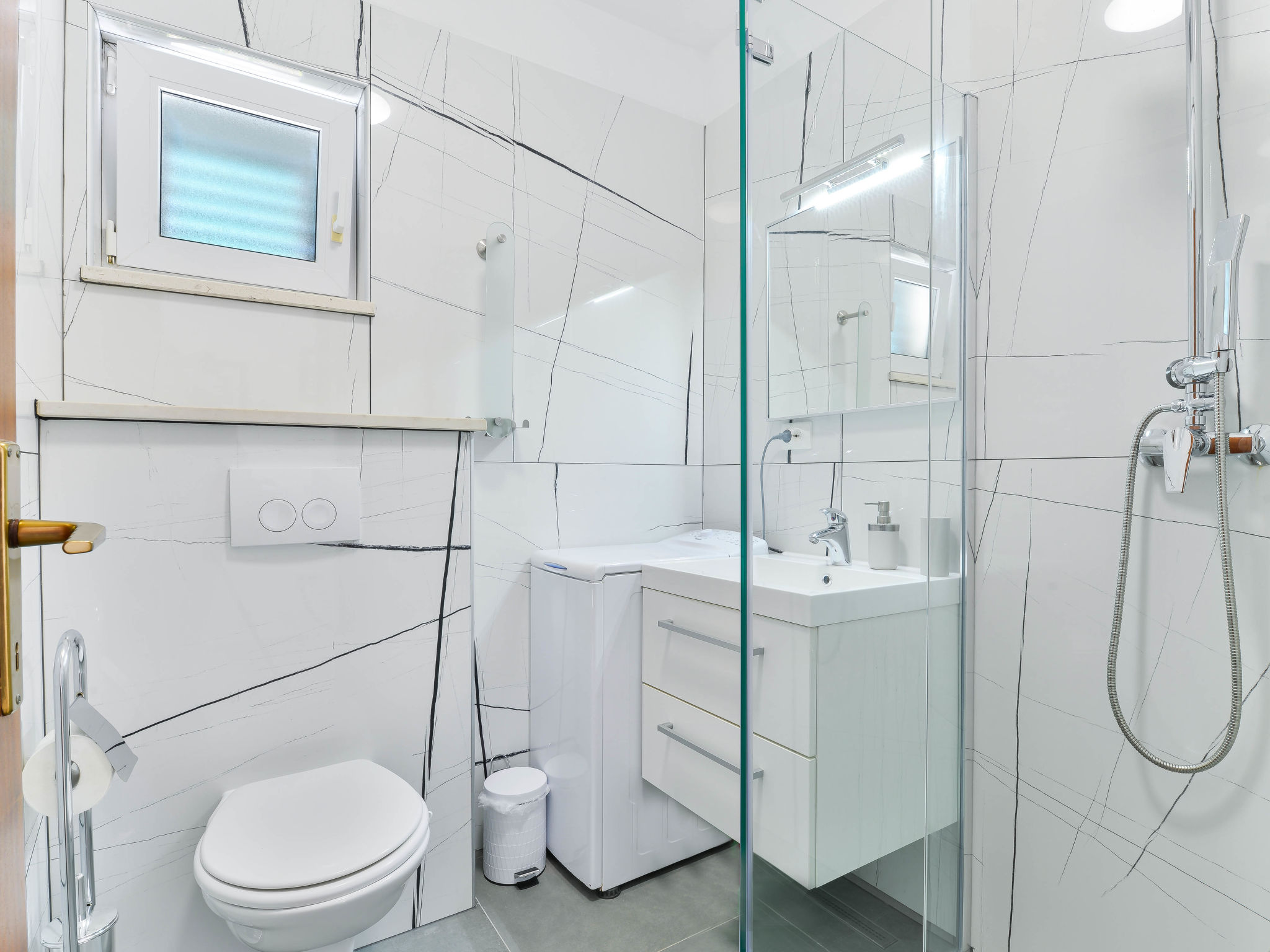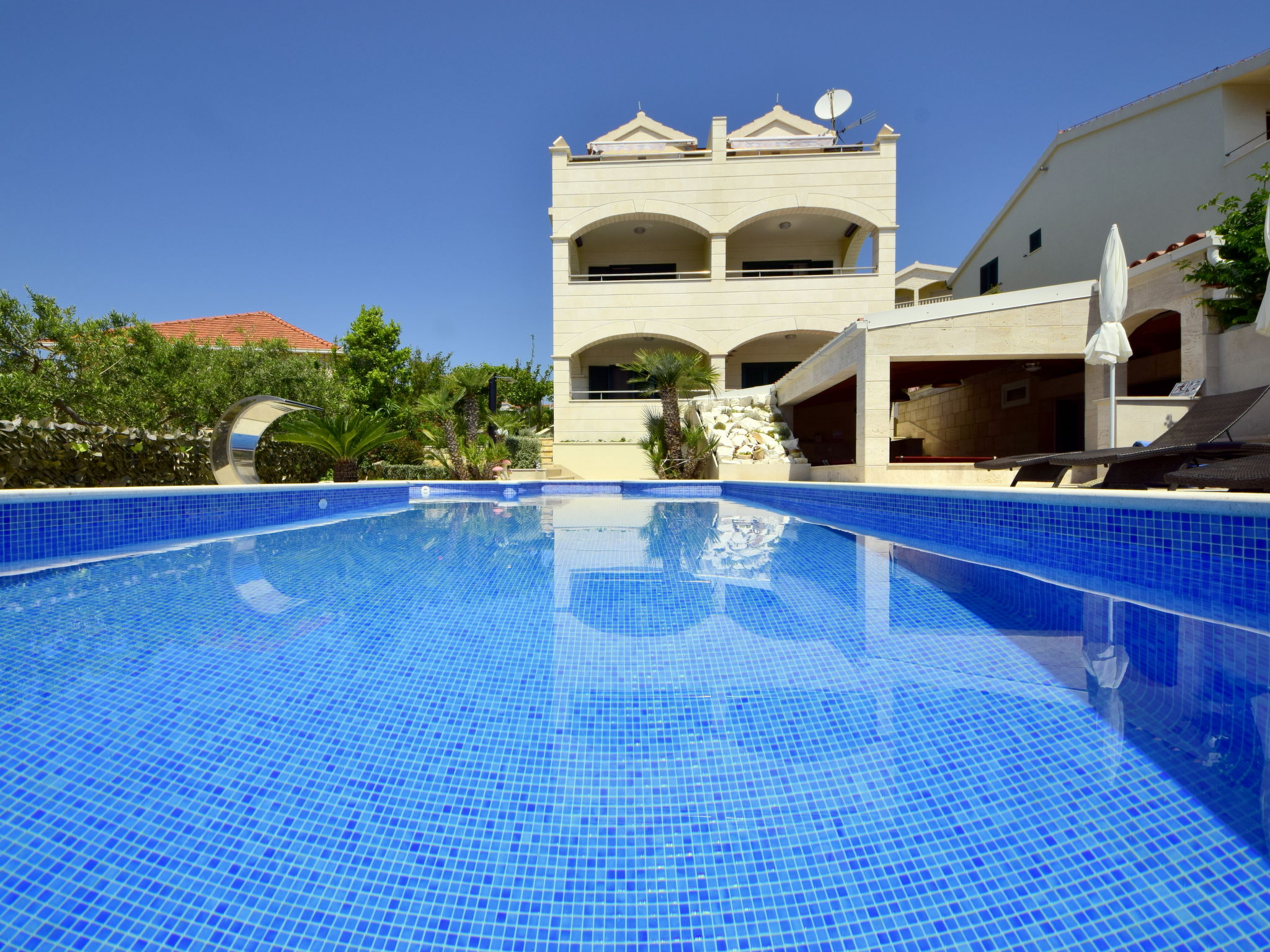 Okrug Gornji (Čiovo), 6 km fra Trogir: Fin flermannsbolig "Villa Andjelka". 1 km fra sentrum av Okrug Gornji, i en roligt, solrikt, høyt posisjon, 50 m fra sjøen, 50 m fra stranden. Fellesbruk: tomt, 1 badebasseng oppvarmt (38 m2, dybde 130- 160 cm dyp, Sesongåpent: 25.Apr. - 03.Okt.) med innbygdetrapper. WC ved bassenget, utendørs dusj, bassenghus med kjøleskap, terrasse, hagemøbler, grill. I huset: internetilkobbling, badstu (ekstra). Vaskemaskin, tørketrommel. Håndkleskift 2 ganger i uken. Parkering ved hbrukt på tomten. El-ladestasjon. Butikk 200 m, restaurant 1 km, café 1 km, bussholdeplass 1.7 km, småstenstrand 500 m, strand ved klipper 50 m. Vennligst merk: Det er flere lignende leiligheter i samme hus. Svømmebasseng med motstrømsmaskin og hydromassasje.