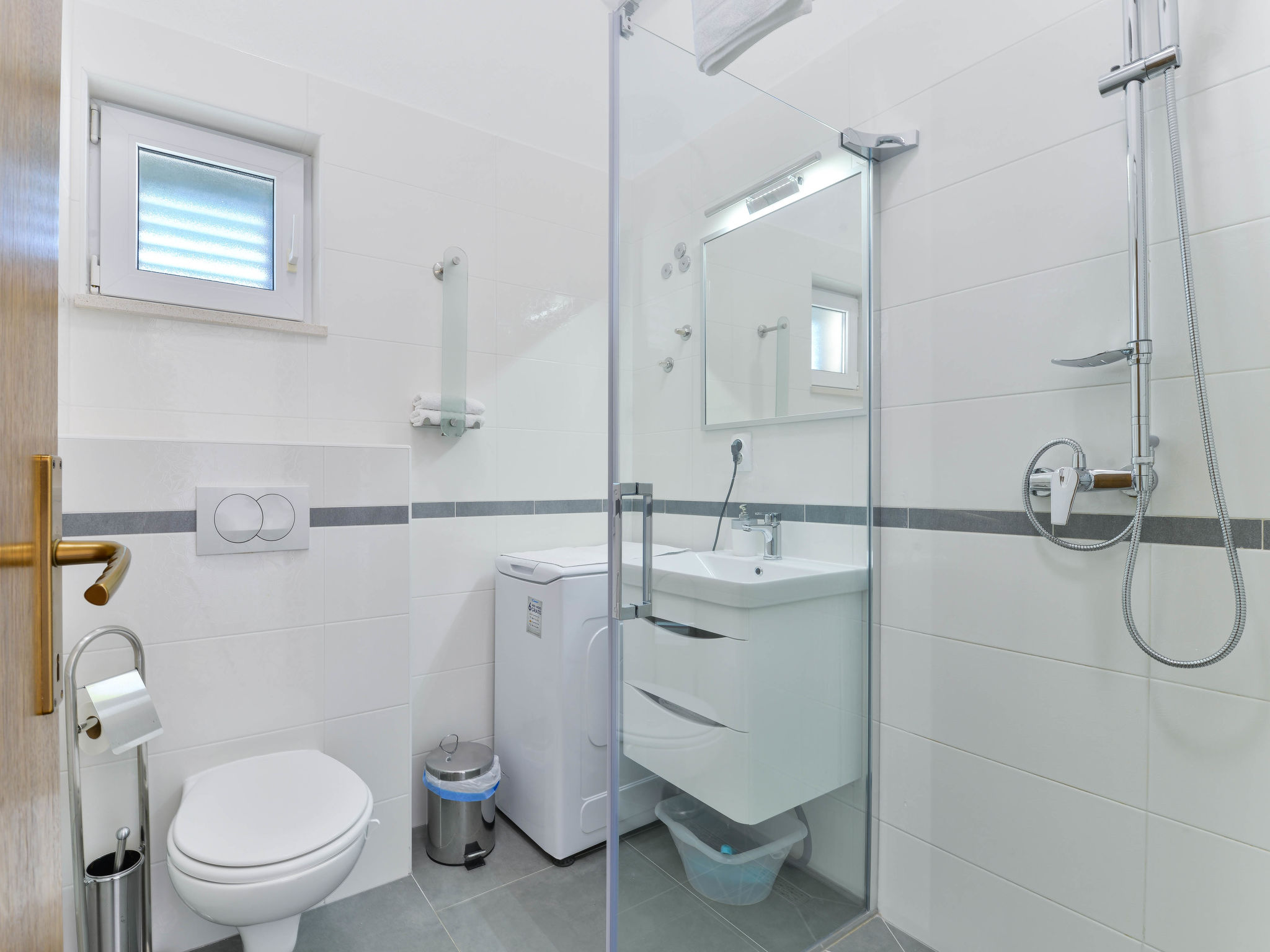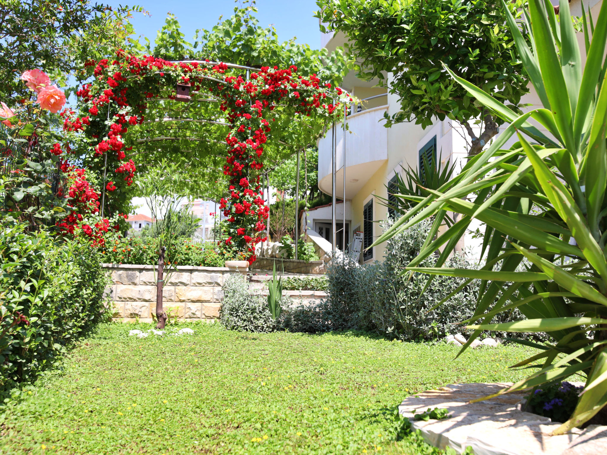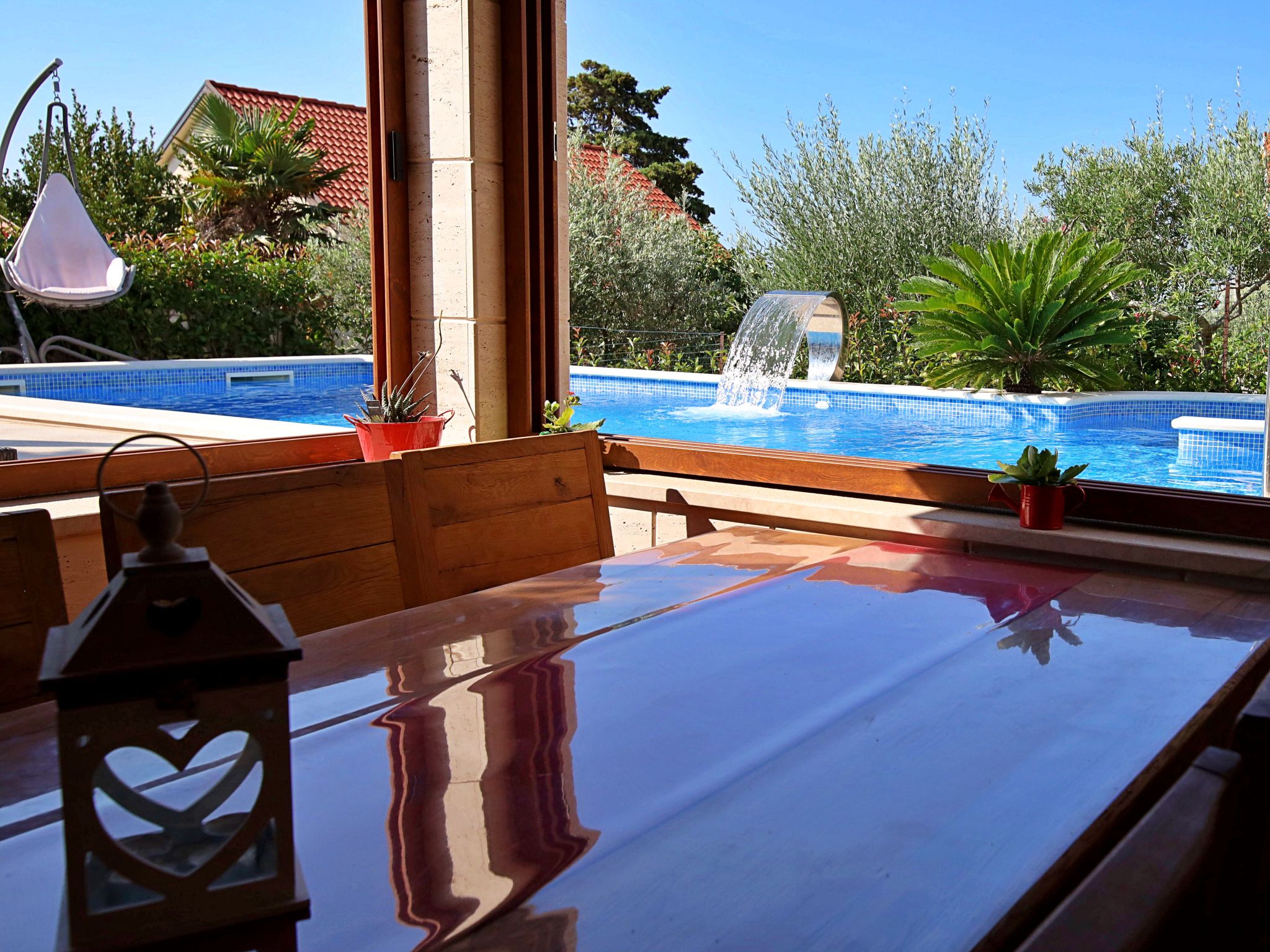 Okrug Gornji (Čiovo), 6 km fra Trogir: Fin flermannsbolig "Villa Andjelka". 1 km fra sentrum av Okrug Gornji, i en roligt, solrikt, høyt posisjon, 50 m fra sjøen, 50 m fra stranden. Fellesbruk: tomt, 1 badebasseng oppvarmt (38 m2, dybde 130- 160 cm dyp, Sesongåpent: 25.Apr. - 03.Okt.) med innbygdetrapper. WC ved bassenget, utendørs dusj, bassenghus med kjøleskap, terrasse, hagemøbler, grill. I huset: internetilkobbling, badstu (ekstra). Vaskemaskin, tørketrommel. Håndkleskift 2 ganger i uken. Parkering ved hbrukt på tomten. El-ladestasjon. Butikk 200 m, restaurant 1 km, café 1 km, bussholdeplass 1.7 km, småstenstrand 500 m, strand ved klipper 50 m. Vennligst merk: Det er flere lignende leiligheter i samme hus. Svømmebasseng med motstrømsmaskin og hydromassasje.