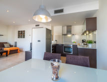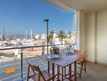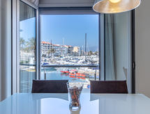 2-room apartment 63 m2 on 1st floor. Bright, very comfortable and modern furnishings: large living/dining room with panoramic window with 1 double sofabed (150 cm), satellite TV (flat screen), electric heating and air conditioning. Exit to the terrace. 1 room with 2 beds (90 cm). Open kitchen (4 hot plates, oven, dishwasher, microwave, freezer). Shower/WC, sep. WC. Panoramic view of the canal and the port. Facilities: washing machine. Internet (WiFi, free). Please note: TV only FR, DE. Property without elevator. HUTG005869 // Reg. Nr.: ESFCTU000017020000100425000000000000000000HUTG0058669